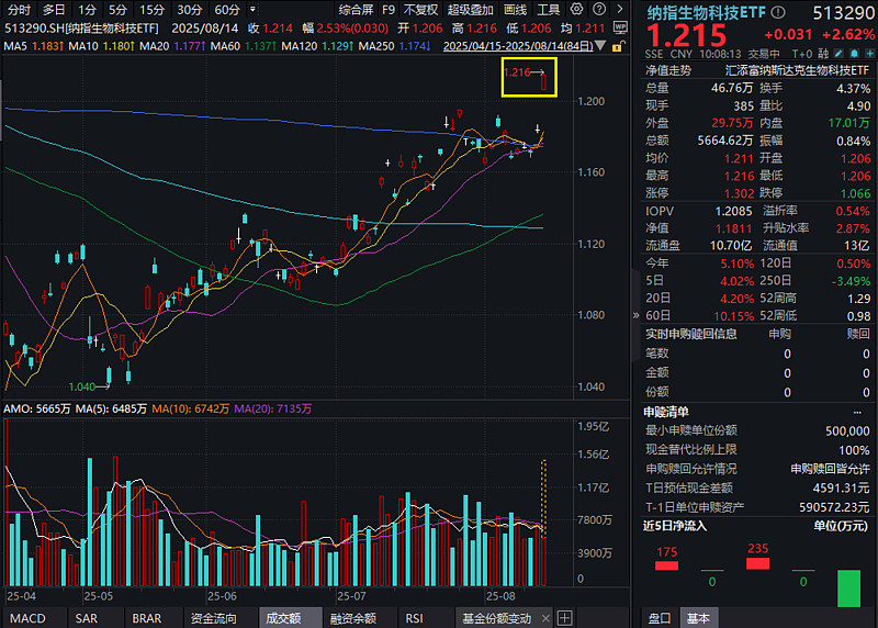 隔夜美股三大指数集体收涨,纳指生物科技指数收涨2.43%,一马当先,道指收涨1.04%,纳指收涨0.14%,标普500收涨0.32%。8月14日截至10:09,$纳指生物科技ETF(SH513290)$ 上涨2.62%,交投爆量,半日成交额已逼近昨日全天。