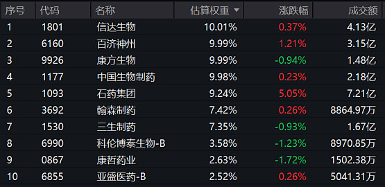 港股通创新药ETF(159570)标的指数权重股涨跌互现:石药集团涨超5%,百济神州涨超1%,信达生物、中国生物制药、翰森制药微涨;下跌方面,康方生物、三生制药、科伦博泰生物-B、康哲药业跌超1%。