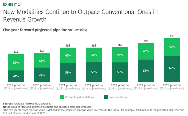 据BCG统计,中国2025年创新疗法(new modalities)在研发管线中的价值已达到1,970亿美元,相比去年快速增长17%,远超传统疗法,创下自2021年以来的最大增幅。2025年创新疗法增长显著,抗体、GLP-1 与核酸药物成为主要推动力。