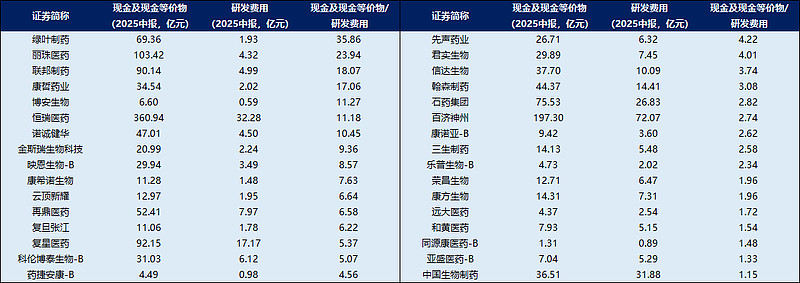 东吴证券通过计算“现金及现金等价物/年研发费用”来评估创新药板块的资金面是否充裕。整体而言,当前医药板块资金面充裕,绝大多数企业仍保持了1年以上的研发资金覆盖能力,能够有效支撑后续临床试验推进、管线拓展及技术创新,为行业长期高质量发展奠定了稳健的财务基础,也为创新药企业的技术突破与商业化转化提供了充足的时间窗口。