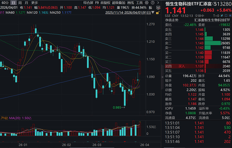 风险提示:基金有风险,投资需谨慎。需关注溢价风险。投资人应当阅读《基金合同》《招募说明书》《产品资料概要》等法律文件,了解基金的风险收益特征,特别是特有风险,并根据自身投资目的、投资经验、资产状况等判断是否和自身风险承受能力相适应。基金管理人承诺以诚实信用、谨慎尽责的原则管理和运用基金资产,但不保证基金一定盈利或本金不受损失。上述基金均属于较高风险等级(R4)产品,适合经客户风险等级测评后结果为进取型(C4)及以上的投资者。请投资者关注指数化投资的风险以及集中投资于国证生物医药指数成分股的持有风险,请关注部分指数成分股权重较大、集中度较高的风险,请关注指数化投资的风险、ETF运作风险、投资特定品种的特有风险等。文中提及个股仅为指数成份股客观展示列举,本文出现信息只作为参考,投资人须对任何自主决定的投资行为负责。本文中的任何观点、分析及预测不构成对阅读者任何形式的投资建议。恒生生物科技ETF汇添富(513280)投资范围包括港股,会面临因投资环境、投资标的、市场制度以及交易规则等差异带来的特有风险。