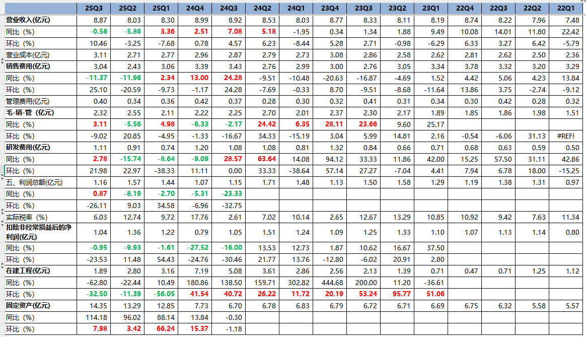 公司研发持续高强度投入,25Q3研发费用同比增2.78%重回正增长。