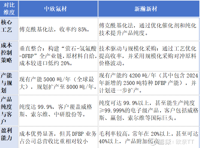经过对比,中欣氟材的优势是具备强大成本优势、能保障大规模稳定供应的供应商,新瀚新材的DFBP纯度更高,在高端领域的供应(如医疗级PEEK)或希望与国际顶尖供应链标准看齐。且已供应威格斯、赢创、索尔维等高端客户,从技术水平上看,新瀚新材更优。