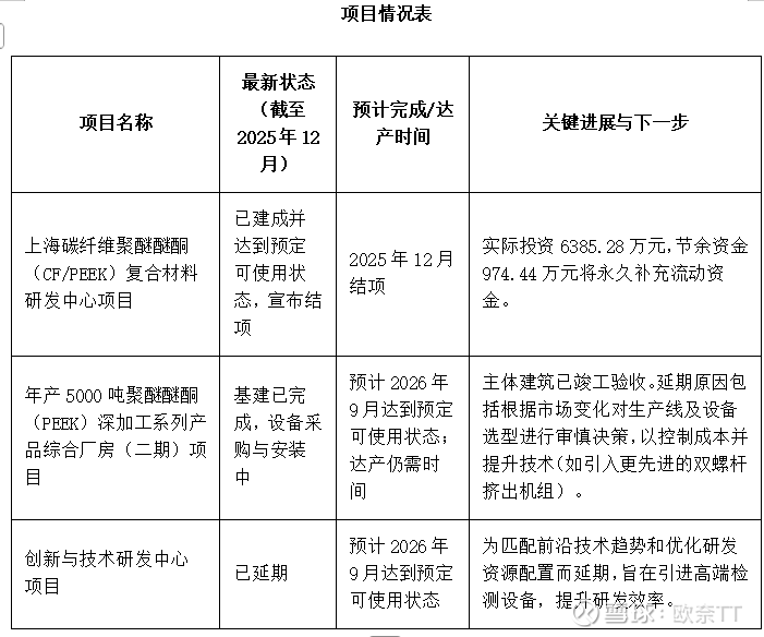 对于“年产5000吨PEEK深加工系列产品综合厂房(二期)项目”。该项目计划投资2.24亿元,建设期2年,预计在2026年9月达到预定可使用状态,并在运营后第3年(即2028-2029年)完全达产。根据几家券商分析指出,该项目理想情况下可为公司带来至少5亿元的营收增量,这意味着公司营收规模有望实现翻倍增长。