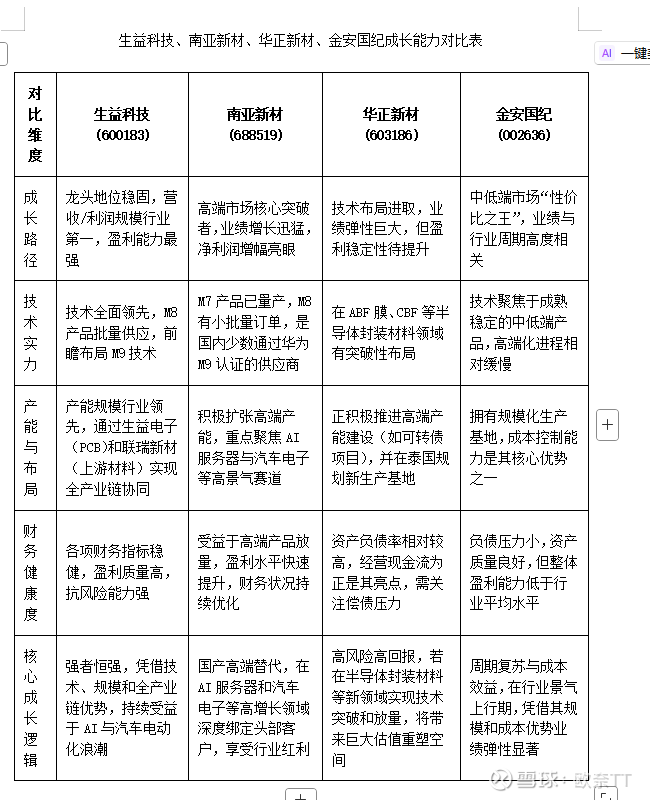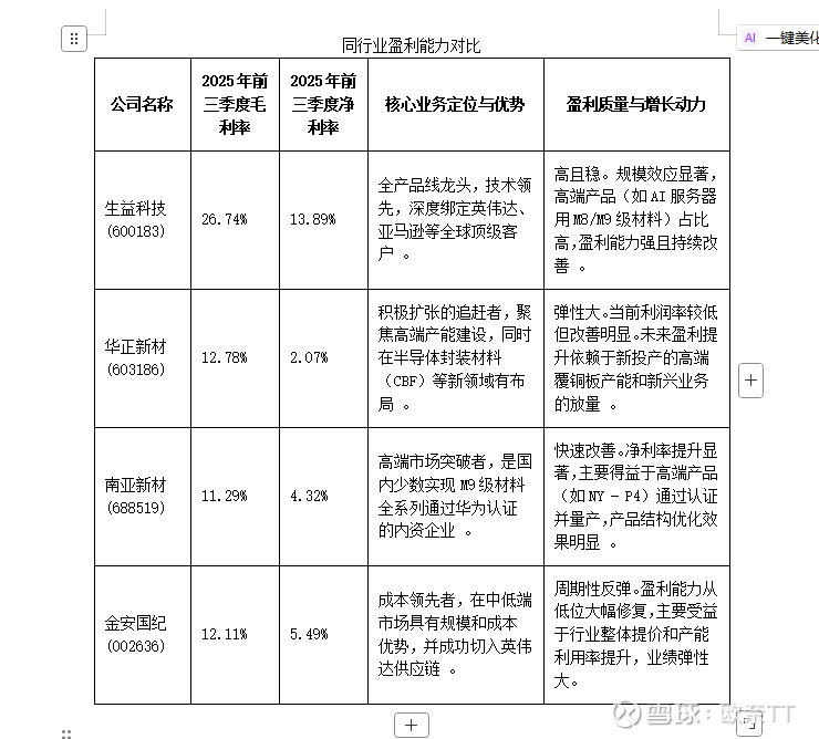 南亚新材:重点是“高端化突围”。它战略清晰,集中资源主攻技术壁垒和利润率最高的高频高速覆铜板,并成功通过华为等国内头部客户的认证,切入AI服务器和智能汽车供应链。这使得它成为AI浪潮中国产替代最直接的受益者之一。一旦其高端产品(如M8/M9)实现大规模量产,其盈利能力和市值空间有望再上一个台阶。