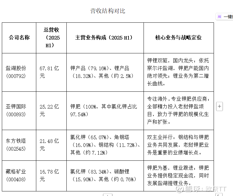 盐湖股份:“钾肥+锂盐”双轮驱动。它的基本盘非常稳固,拥有500万吨/年的钾肥产能,是国内最大的生产商。其独特的优势在于资源综合利用,从盐湖卤水中先提钾再提锂,这种梯级开发模式显著降低了碳酸锂的生产成本。2025年上半年,其碳酸锂毛利率接近50%,成本优势明显。其营收结构显示,公司战略是通过钾肥这个“压舱石”业务保证稳定盈利和现金流,同时用更具成长性的锂业务来提升整体估值和想象空间。