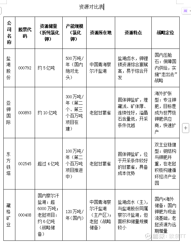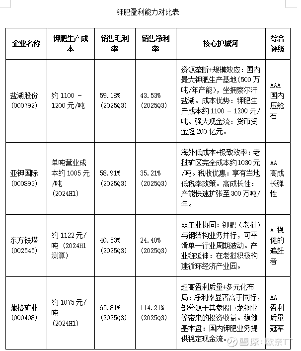 东方铁塔:的钾肥业务是其双主业战略中的重要一环。公司在老挝拥有4亿多吨的资源储备和100万吨的产能,虽然规模不及亚钾国际,但同样位于开采条件优良的甘蒙省,并已建成40万吨/年的颗粒钾产能,产品附加值更高。公司的特点是稳健经营,并注重产业链协同,正在推进老挝循环经济产业园的建设,通过光伏、溴素、复合肥等项目来降低综合成本、提升整体效益。