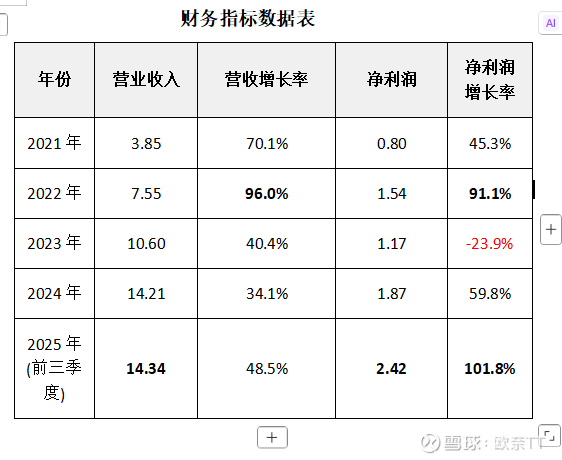 营收与净利润:公司2024年营收14.21亿元,同比增长34.11%;归母净利润1.87亿元,同比增长59.80%。这一高速增长势头在2025年得以延续,2025年前三季度营收14.34亿元,同比增长48.47%;归母净利润2.42亿元,同比增长101.77%。公司预计2025年全年净利润为3.83亿元至4.32亿元,同比增长104.89%至131.10%。
