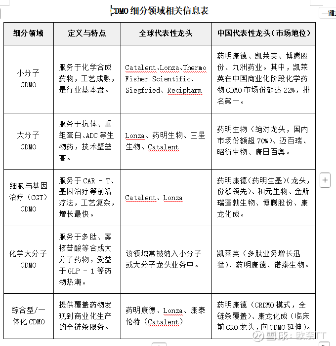 根据2024-2025年的营收数据,全球CDMO行业已形成清晰的头部阵营