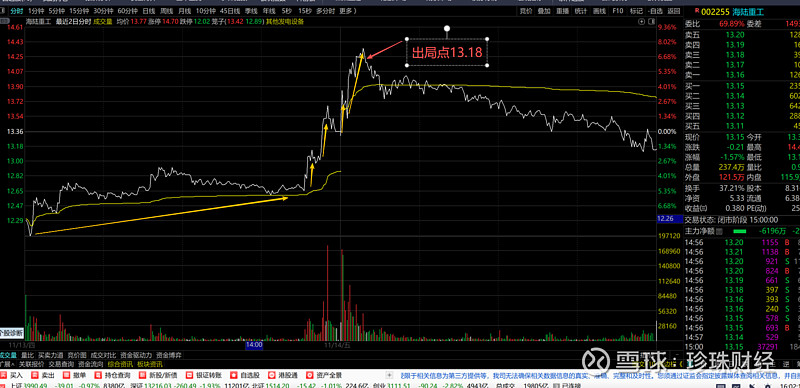 周四主力继续低杀洗盘。我看了下前三天的成交额,总成交接近113亿。单日换手来看,周一换手54.19%,周二换手40.74%,周三换手32.64%;总换手接近128%。就是说筹码几乎全换了一遍,胆子略小的投资者都被清洗出局。所以当时判断主力一定会暴力拉升。到了午盘临近收盘时,主力果然暴力直奔涨停。可能是当日振幅太大的原因,涨停板被巨单砸开。但我判断拉升过程中主力大资金未出,故预判在周五也就是今日必须拉高才能出掉拉升筹码。所以早上挂单继续观察。拉到接近8%时,我看了下主力已经很难封涨停,且两日分时图看浪型已经到了第九浪。所以果断出手,卖了一个14.18,涨幅6.21%的价格。实现整体上盈利出局。