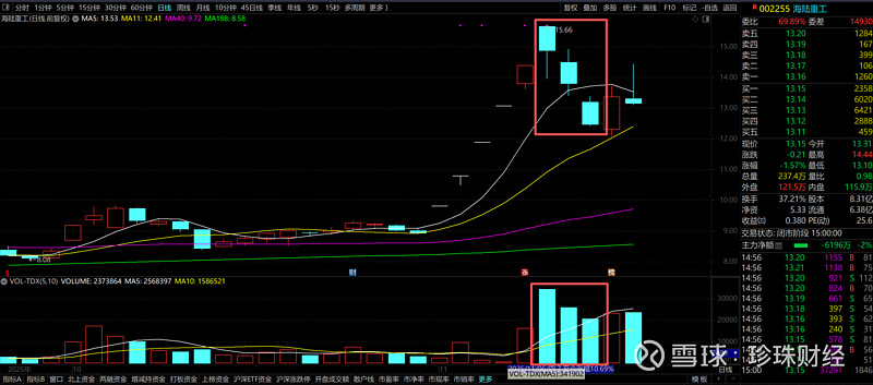 海陆重工是这周最难操作的一个票。关注到该票是在周二的跌幅榜上。当时决定进场主要有两个原因,一是上一日换手率奇高,高达54%,成交金额高达51亿。属于典型的高位换庄。二是洗盘过程属于高山流水俯冲式洗盘,这种洗盘模式对重仓持有者心里打击面极大。同时,从高位下杀到我关注时,整体跌幅超过15%。所以当时只看了两秒钟就决定入手。