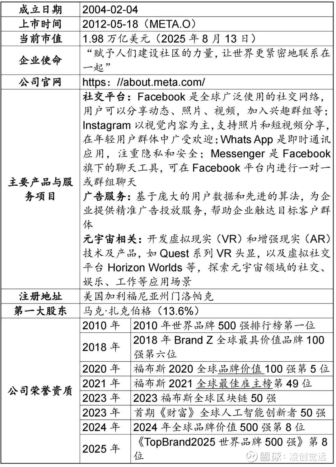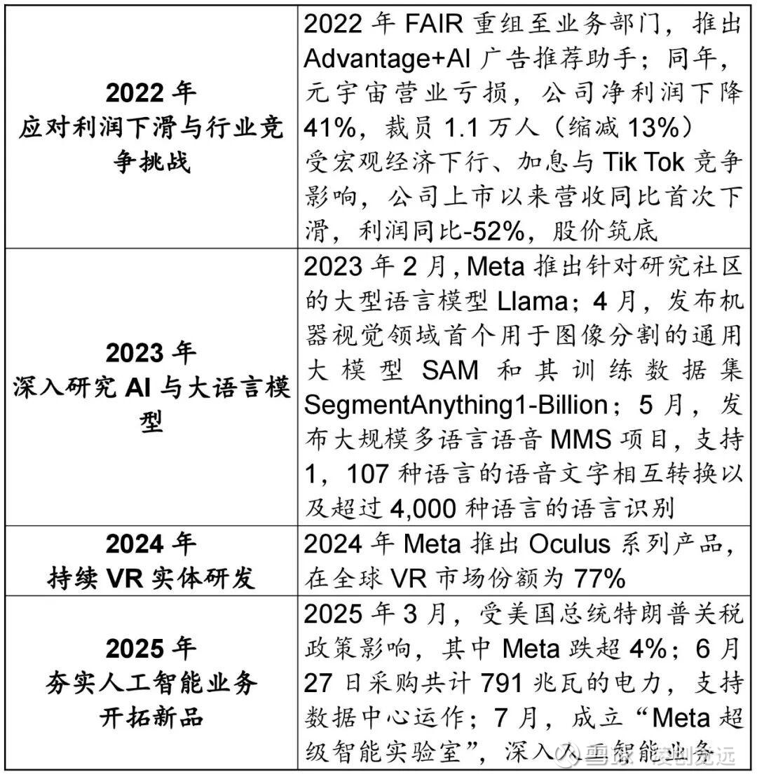 2、2023年~2024年,Meta通过“战略收缩+AI布局”实现关键转折,市值总体呈现上升趋势。裁员超2 万人,降本增效,削减非核心业务(如部分 VR 内容团队),2023年运营支出同比降8%,利润率触底回升;同时,Meta 大力投入人工智能和机器学习技术,对广告投放算法进行深度优化,推出Advantage +广告系统,用大模型优化创意生成、投放策略,通过算法能够更精准地分析用户的兴趣爱好、消费习惯等数据,进而将广告精准地推送给目标受众,提高广告投放的效果,广告主ROI提升12%,2023Q4广告收入同比增20%,扭转连续5个季度下滑趋势;此外,Meta重新审视元宇宙业务布局,将资源更多地集中在具有潜力的核心项目上,如VR设备的研发和优化,以及构建更具吸引力的元宇宙内容生态,在VR设备方面,对Quest系列设备进行持续改进,提升硬件性能和用户体验,吸引了更多消费者购买,Meta总市值上升迅速。