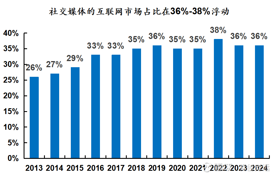 社交媒体的互联网使用时长增长至143分钟。根据Sociallyin最新报告显示,截止到2025年6月,社交媒体用户日均使用时长从2012年的90分钟飙升至143分钟(增幅近60%)。此外,根据国证国际调查显示,当前用户的社交媒体使用时长进入稳定阶段,对上网时长的占比约为36%-38%,社交媒体间用户时长争夺或将呈现此消彼长趋势。