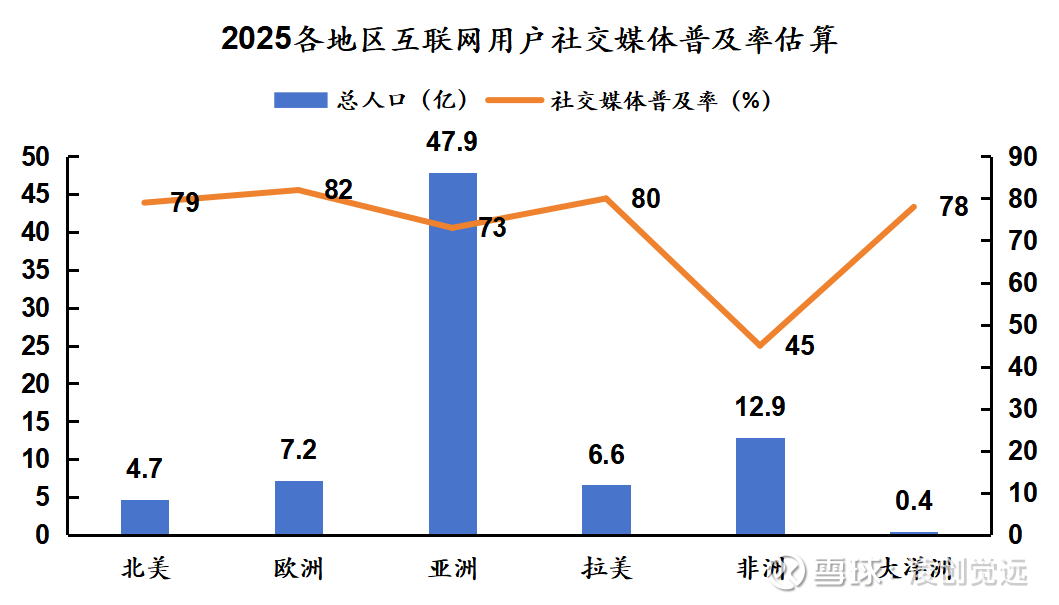 全球社交媒体发展呈现出典型的“不均衡性”,不同地区市场在使用水平和成熟度上仍呈现出显著的差异,社交媒体市场渗透程度不一。