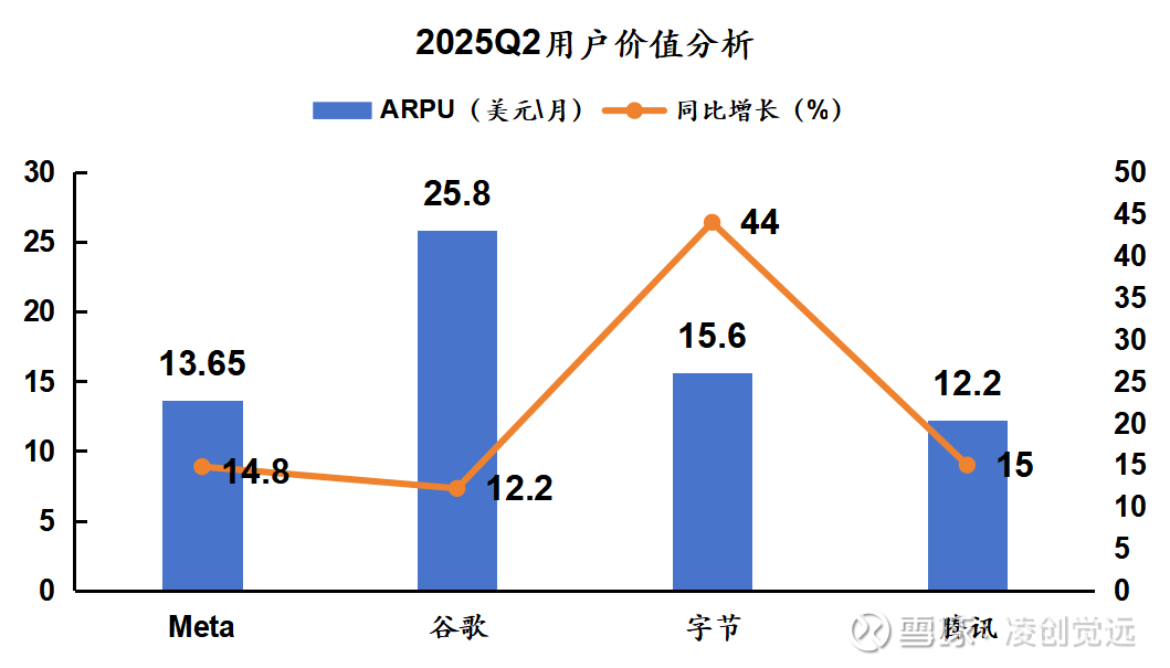 Meta凭借AI广告技术提升提高广告投放的精准度,AI模型使Instagram广告转化率提升约5%,Facebook广告转化率提升约3%,这种转化率的提升直接转化为广告主愿意支付更高的价格,推动了单条广告价格的上涨;谷歌依靠搜索与YouTube广告的AI优化以及云业务的快速增长,收入可观推动ARPU位于第一;字节跳动则通过TikTok全球化扩张和抖音高变现效率,实现了ARPU的高速增长;腾讯在视频号广告加载率提升和游戏业务增长带动下营收显著增加,视频号广告收入增长超60%,此外腾讯通过将AI技术应用于游戏中,提升了用户参与度和留存率,进而提高了ARPU。