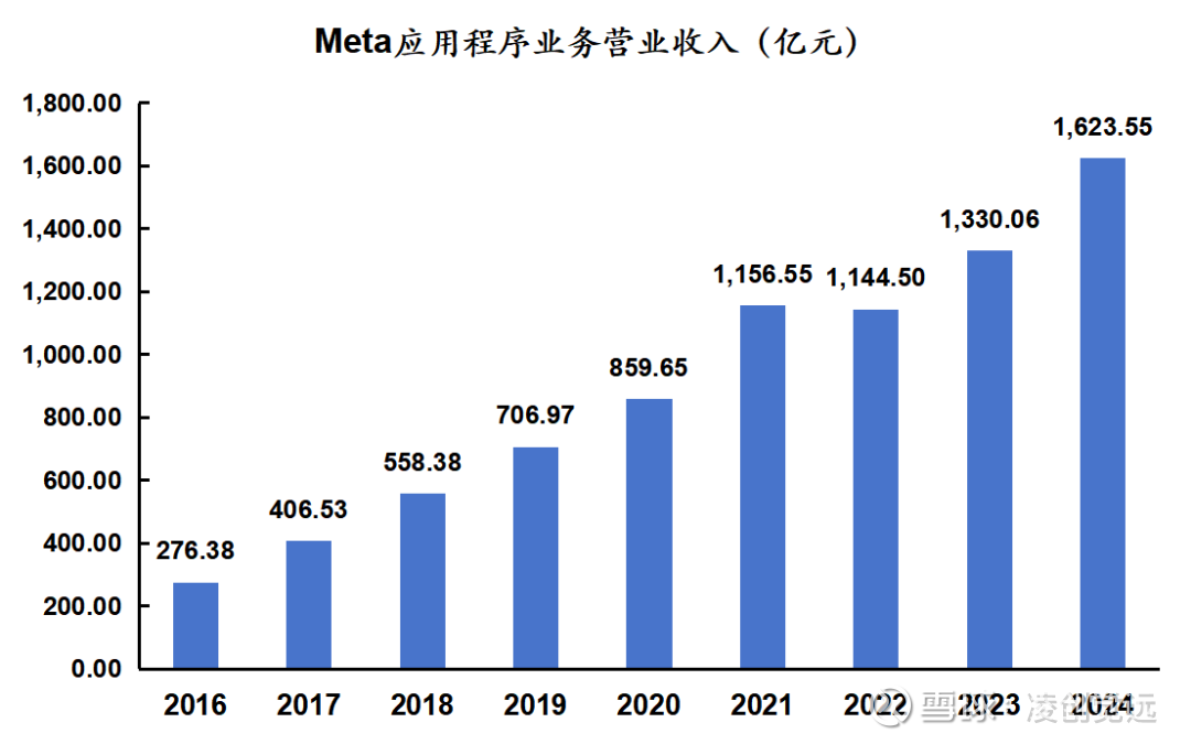 2024年Meta的营业收入为1,645.01亿美元,主要来自应用程序系列产品,包括Facebook、Instagram、Messenger、WhatsApp和Threads等,同比增长22%.主要由于:(1)日活跃用户数多达33.5亿,同比增长5%,推动广告收入提升;(2)人工智能应用优化广告投放和内容推荐,精准定位用户喜好,提高了广告定价和投放效率,并吸引更多广告主;(3)AI广告推荐模型使用更多信号和更长上下文信息,显著优化转化效果,Instagram和Facebook广告转化率分别提升5%和3%,(4)将Latice引入广告推荐的初期流程,推动FacebookFeed和Reels的广告转化率增长了近4%,(5)现实实验室增加2.5亿美元,同比增长13%,主要是硬件产品的销售。