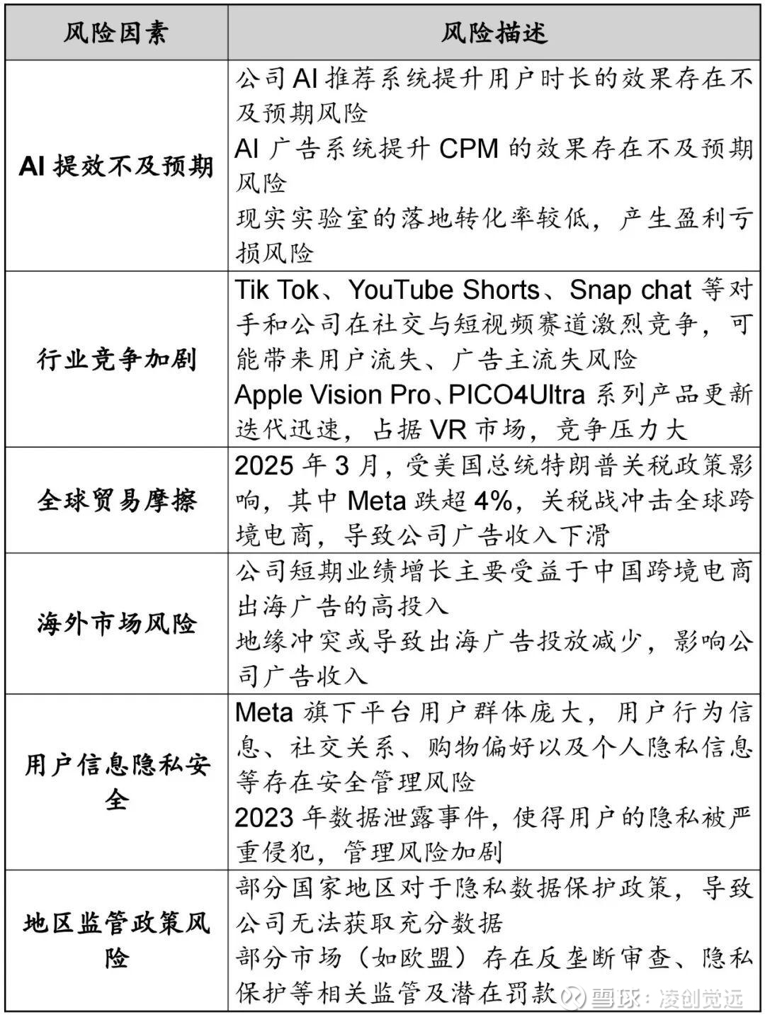 与此同时,Meta仍需面对多重风险:(1)Meta面临严格的全球监管环境,尤其是在数据隐私、反垄断和内容审查方面,数据泄露、法律诉讼和合规成本增加,监管压力可能影响其广告业务和用户增长。(2)Meta在AI领域投入高达720亿美元,执行落地存在进度和成本风险,AI技术的迭代速度和商业化落地效果不及预期,也可能影响其长期增长。(3)Meta在社交媒体和广告领域的竞争激烈。TikTok、Snapchat等新兴平台持续进攻,用户和广告收入可能受到冲击。