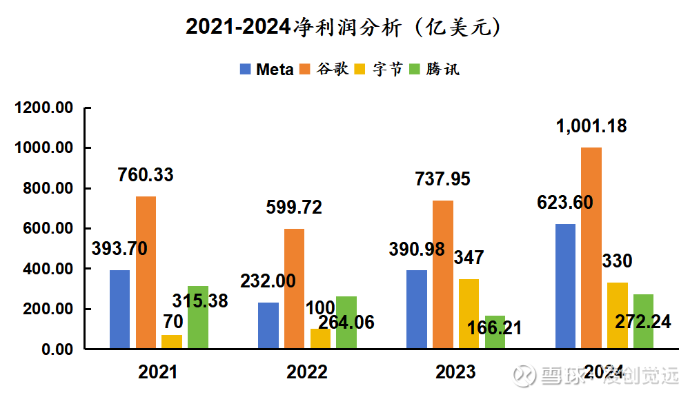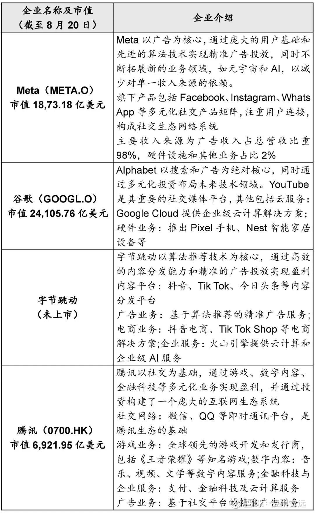 谷歌和Meta作为全球最大的广告平台,凭借其庞大的用户基础和先进的数据分析技术,净利润规模显著高于腾讯和字节跳动。谷歌的广告服务覆盖了全球数十亿用户,通过精准的广告投放和个性化推荐,实现了极高的广告转化率。Meta则依托Facebook和Instagram等社交媒体平台,利用用户的社交行为数据,为广告主提供高度定制化的营销方案。相比之下,虽然腾讯和字节跳动在中国市场拥有庞大的用户群体,但受限于国际市场的拓展和广告技术的成熟度,其净利润规模仍不及谷歌和Meta,腾讯高利润主要得益于游戏业务恢复增长和视频号广告贡献显著,视频号平台上的丰富内容吸引了大量用户,进一步提升了广告收入。
