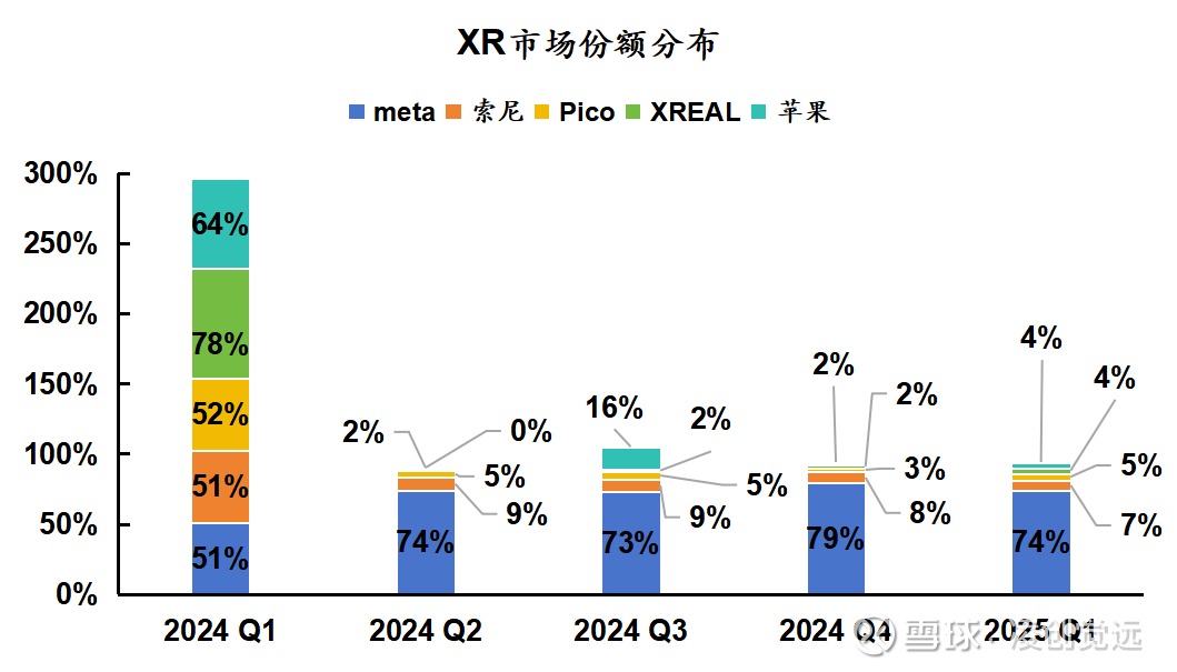 Meta是当前全球VR/AR设备市场的领导者,2024Q4出货量口径统计下市占率高达79%。Meta的AI设备持续强劲增长,从长期来看拥有巨大的发展空间。