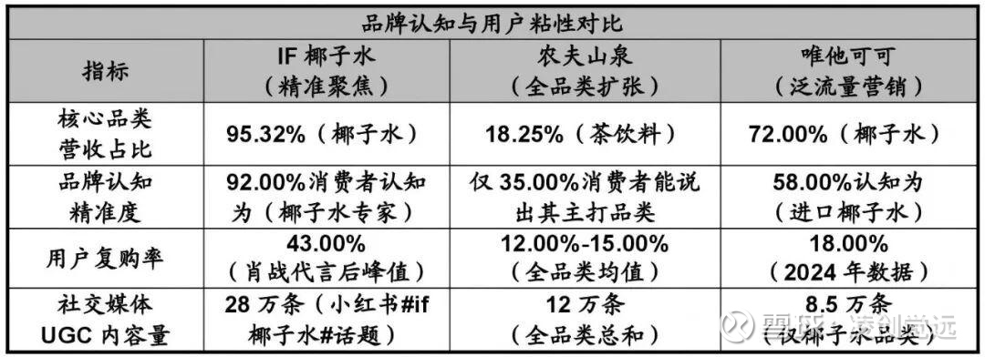 其核心竞争力在于将95.32%资源投入单一品类,同时通过小红书、抖音等垂直渠道实现28万条UGC内容裂变,在椰子水市场建立34%的绝对市占率,且用户复购率(43%)、价格弹性(提价10%销量仅下滑3%)等关键指标显著领先行业平均水平。