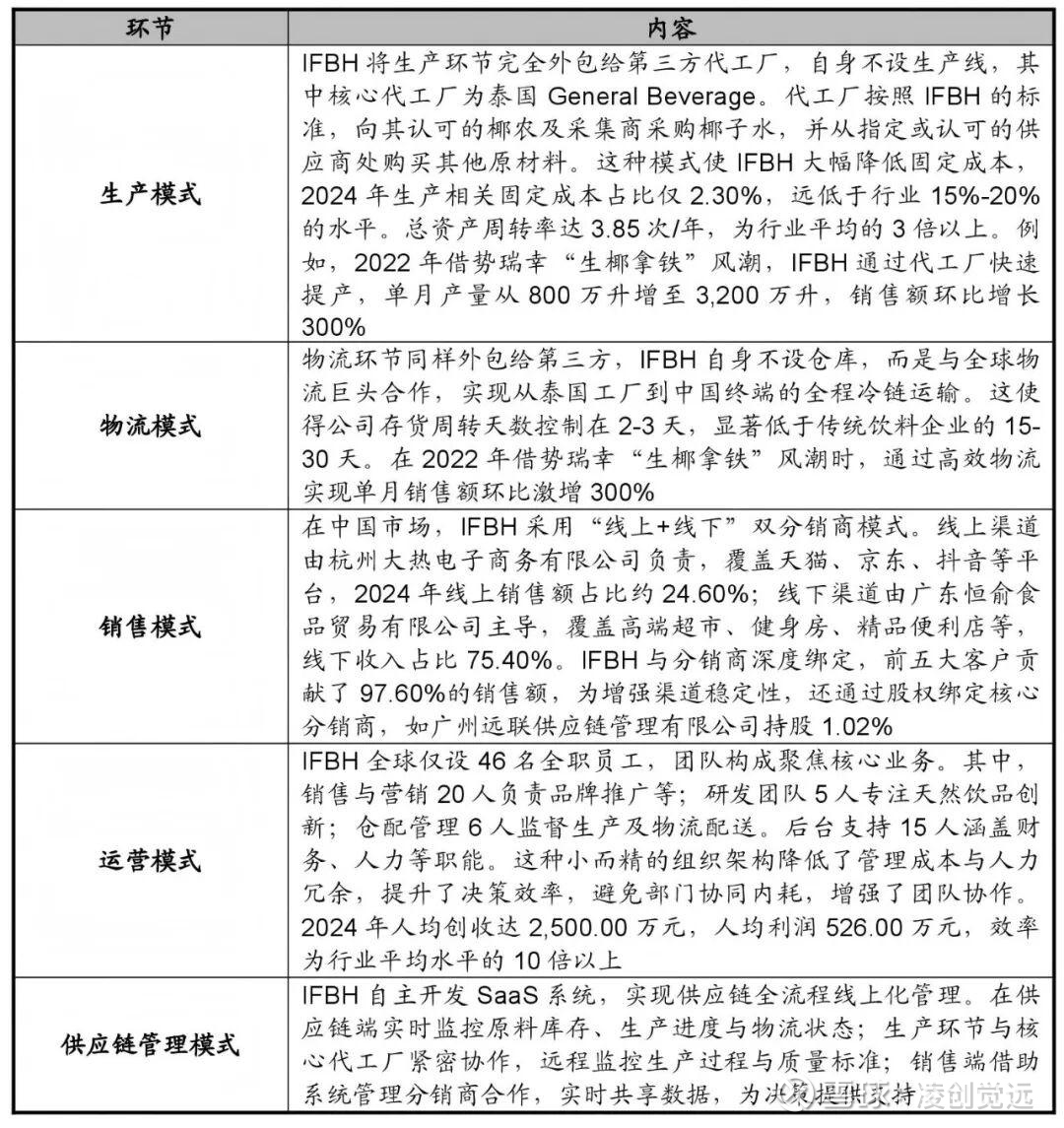 IF采用全链条外包的轻资产运营模式,从生产、物流到销售均委托第三方完成。IF将生产环节完全委托给第三方代工厂,自身不设生产线。核心代工厂为泰国General Beverage(创始人彭萨克旗下企业),负责供应所有椰子水原料。2024年,IF向五大供应商采购金额达9700万美元,占采购总额的96.90%,其中General Beverage供应占比超70.00%。