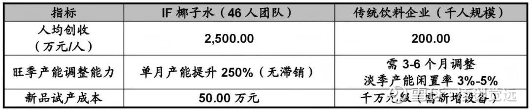 二是聚焦品牌与市场,46人团队中仅5人负责研发、20人专注销售,人均创收2,500.00万元,是行业平均的12.5倍,且能快速响应市场变化,如2022年借势生椰拿铁风潮实现单月销售额环比增长300%。