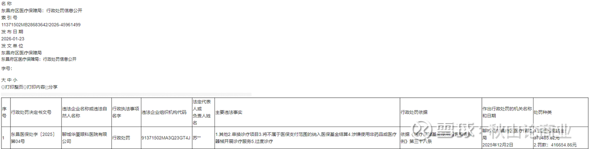 根据山东省聊城市东昌府区医疗保障局今年1月23日发布的公告,聊城华厦眼科医院有限公司2025年12月2日被罚款41.67万元,并退回违规基金37.05万元。