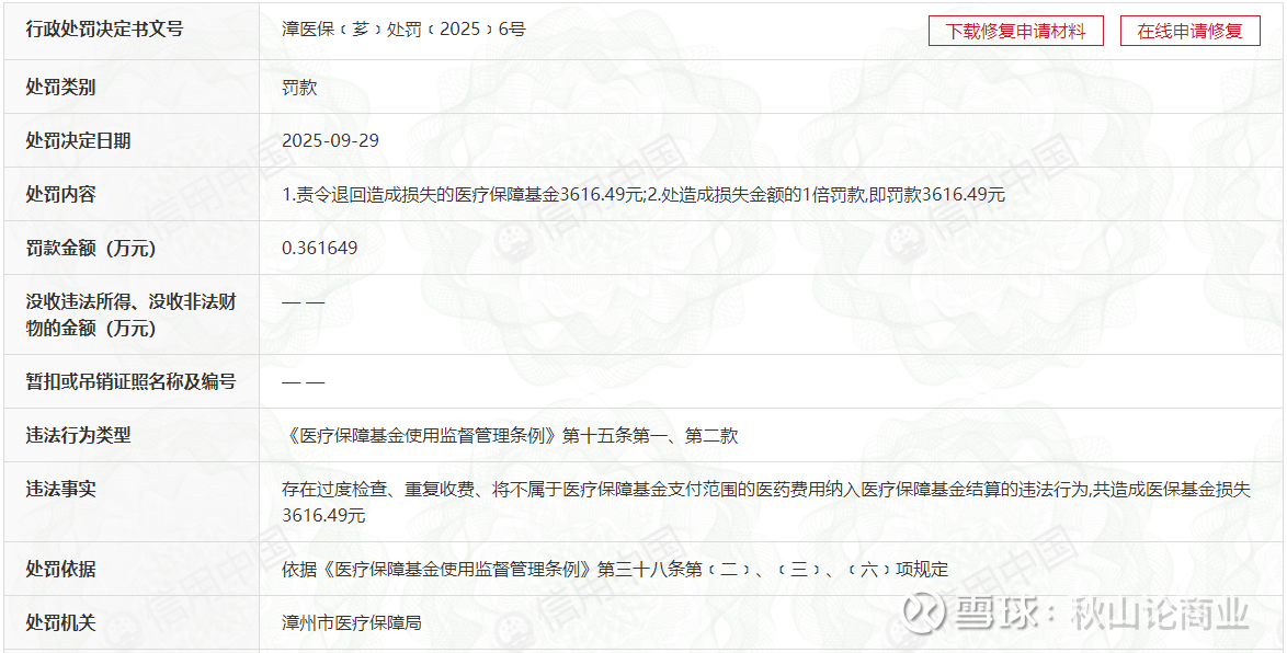 佛山华厦眼科医院有限公司同样存在医保违规问题,2025年6月4日被佛山市医疗保障局禅城分局罚款3.96万元,原因是存在违法使用医疗保障基金的情况。漳州华厦眼科医院有限公司则是在2025年9月29日被处罚,原因是存在过度医疗、重复收费、将不属于医疗保障基金支付范围的医药费用纳入医疗保障基金。