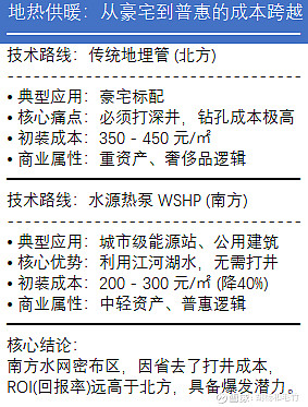 周末关于地热的讨论非常有价值,刚刚大杨老师和球友 @大杨能源笔记 在评论区聊到一个细节,金茂府朗诗等主打恒温恒湿的高端住宅,核心技术底座正是地热地源热泵。既然体验这么好的豪宅都在用,为啥没普及?其实就是卡在成本上,翻阅中国地热能产业发展蓝皮书及工程造价指引,传统的地埋管技术需要大量钻孔,初装成本高达350到450元每平米,这个门槛注定了它以前只能是别墅和豪宅的奢侈品。
