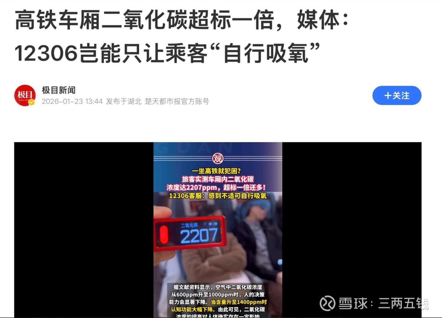 根据极目新闻2026年1月23日的报道,高铁车厢内二氧化碳浓度实测高达2207 ppm,远超《室内空气质量标准》(GB/T 18883-2022)规定的≤1000 ppm限值。舆论普遍批评铁路部门对乘客健康关切回应敷衍,仅建议“自行吸氧”,缺乏系统性解决方案。若铁路系统后续确实推动车厢空气环境改善(如升级通风、新风或空气净化系统),将直接利好以下几类A股上市公司: