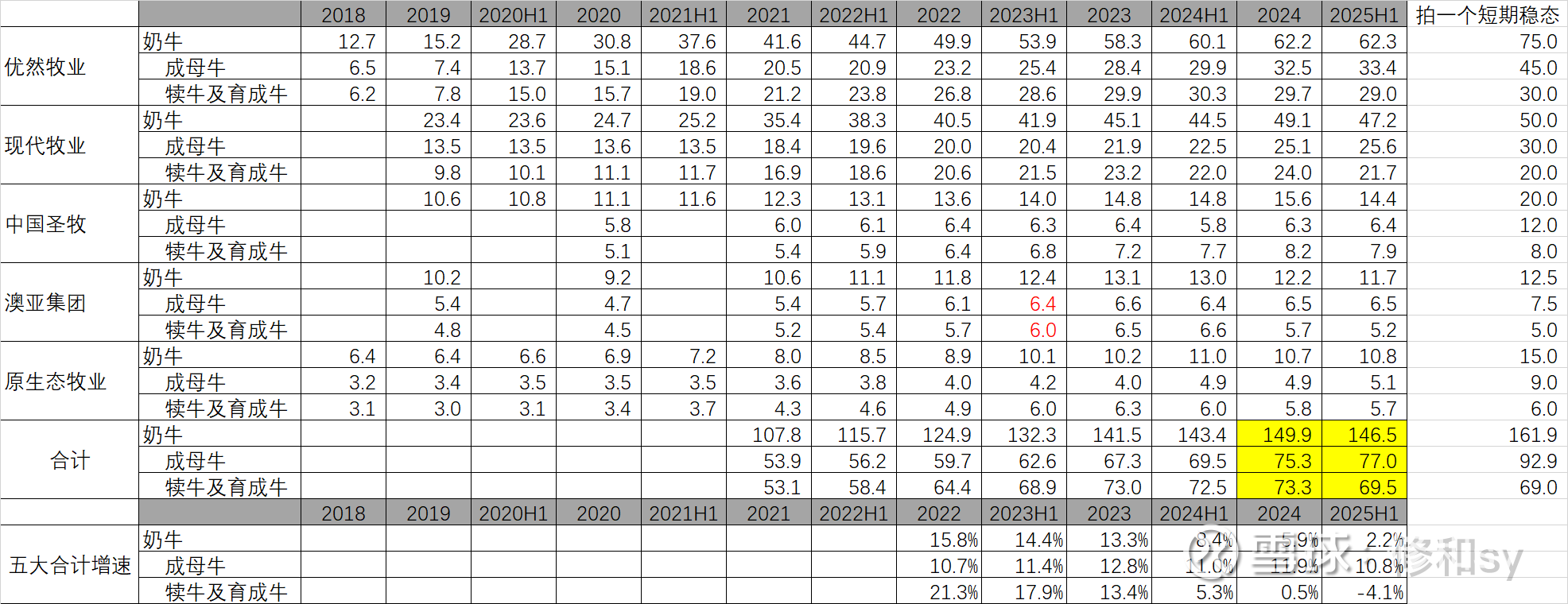 1、五家牧业上市公司的存栏,已经开始出现明显增速下滑了,尤其是后备牛,2025年半年报头部五家上市公司的后备牛存栏数开始出现了4%的同比下降。