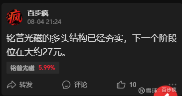 【铭普光磁】我最早在8月4日就发帖预报阶段顶在约27元(建议翻一下我之前的贴验证),后在8月25日再次提示。今天最高26.5元,误差仅1.85%。散户要在股市获利,提前埋伏,买在起涨点,卖在出货位,才能稳稳获利。及至价格涨上去,成为市场热点才开始追,大概率又在洗盘、震仓中成为炮灰,因为已错失最佳交易机会。