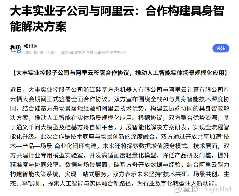 大丰实业:9月25日,浙江硅基方舟机器人有限公司与阿里云计算有限公司在云栖大会期间正式签署全面合作协议。双方宣布将围绕全栈AI与具身智能技术展开深度协同,结合硅基方舟在文娱、旅游、体育、商业等场景的落地经验,以及阿里云在云计算与大模型方面的技术优势,共同构建云边端协同的具身智能解决方案,推动人工智能在实体场景中的规模化应用。公司与上海智元新创技术有限公司签订《战略合作协议》,双方拟结为战略合作伙伴关系。合作内容包括共同投资设立合资公司,注册资本1000万元,大丰实业持股85%、智元机器人持股15%。