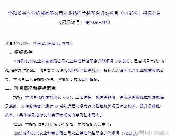 洛阳长兴农业机械有限公司宣布将为其农业精准管控平台升级项目采购拖拉机虚拟展示系统,利用虚拟现实和三维建模技术让客户远程沉浸式体验拖拉机外观及内部结构,以提升品牌推广效率。该项目已获批准并具备招标条件,采用公开招标方式,要求投标人具备合法资质、良好信用记录且不得联合投标。招标文件可在规定时间内现场或线上获取,售价500元,投标文件需在2025年12月17日前通过远程不见面方式递交并参加腾讯视频会议开标。