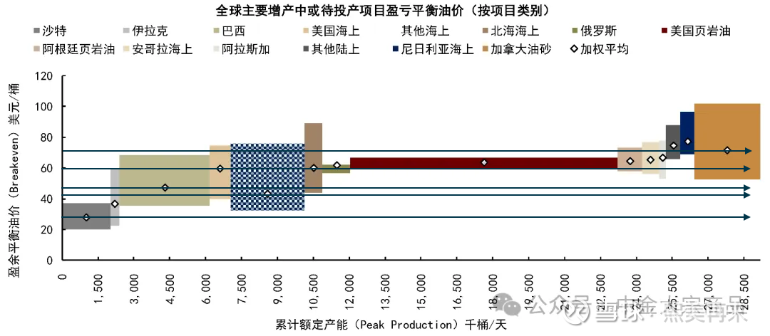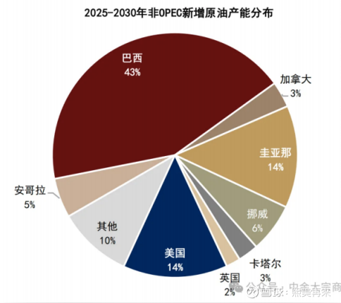 中金列出的主要全球待投产项目共计2,850万桶, 其中美国页岩油就有1000万桶,但是下图中又显示巴西占比非OPEC增量的43%,这两者中是不是有一个是错的?假设上图给出的巴西增产400万桶和下图给出的巴西占比非OPEC增量43%是对的(根据巴油最新的五年计划,2030之前计划的产能投放大约是230万桶,考虑其他MNC在巴西的项目投入,400万桶增量至少不那么离谱),43%=400万桶,400/43%=930万桶,美国增产930*14%=130万桶,2,850-(1,000-130) =1,980万桶。5年投产1,980万桶,每年396万桶,即使按照比较乐观的衰减率4.7%,按照年产量1.03亿桶(2024全球产量),衰减也要达到484万桶,待投产项目加起来也不够抵消自然衰减的,如果衰减率加速回升的话,缺口会很大。我哪里算错了吗?