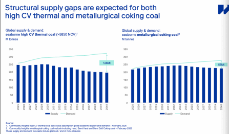 两家海运出口煤的头部矿商, WHC和Yancoal, 在上月的年度报告中再次指出了高卡煤和动力煤市场的供给缺口风险(见下图)。其中,WHC主要聚焦高卡煤和焦煤,兖澳的预测则是基于海运动力煤市场。兖澳图表中,2025-2029高卡煤市场存在供给缺口,2030后供给缺口的逆转则是基于伍德麦肯兹“煤炭需求2027/2029见顶回落”的预测,但正如兖澳指出的,伍德麦肯兹的峰值预测自2021年起就不断被推后。