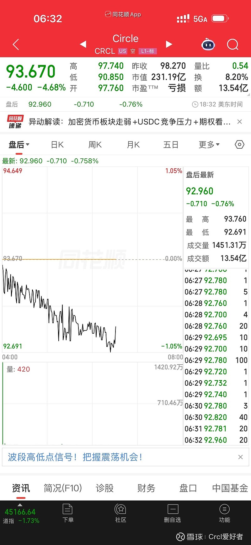 从行情数据来看,Circle当日股价开盘即走弱,以97.760美元低开后震荡下行,盘中最低触及90.850美元,最终收报93.670美元,较前一交易日收盘价98.270美元下跌4.600美元,市值蒸发超11亿美元。盘后交易阶段,股价延续跌势,报92.760美元,较收盘价再跌0.97%,显示市场看空情绪尚未完全释放。从交易数据看,当日换手率达8.19%,量比0.54,虽成交量未出现明显放大,但股价的单边下行趋势,已充分反映资金对公司前景的谨慎态度。