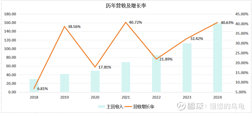 █ 东鹏饮料2018-2024历年营收及年增长率图:营收年化增长率31.68%;