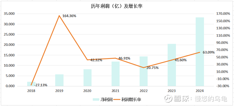 █ 东鹏饮料2018-2024历年净利及年增长率图:利润年化增长率57.76%;