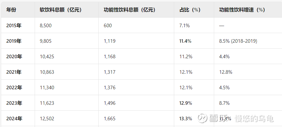 下表为2015-2025年功能性饮料在饮料总额中的占比变化: