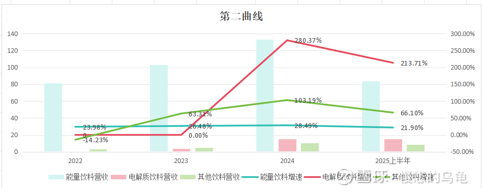 第二曲线(电解质饮料、其他无糖茶饮等)营收增长率评估: