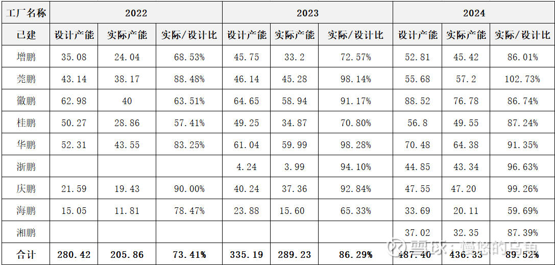 基于年报上在建与规划产能进度情况,2022年-2024年产能实际情况如下表: