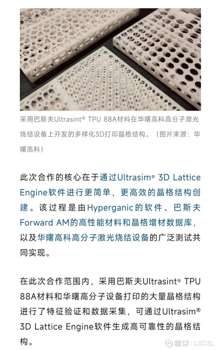 华曙高科在这方面的技术是和巴斯夫合作的,巴斯夫是世界顶级的TPU制造商,提供了TPU材料和晶格增材数据库。之前在华曙公众号里有明确揭示过双方的开发路径。