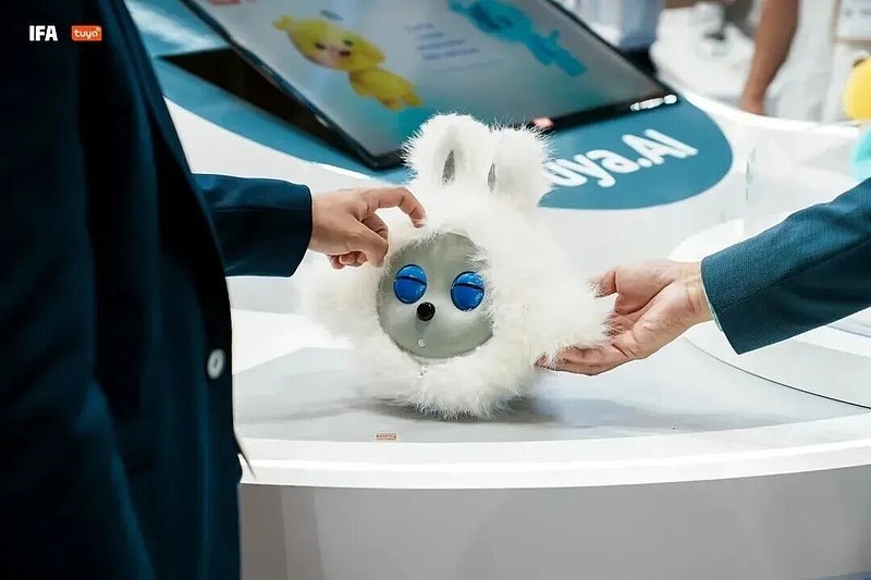 $涂鸦智能(TUYA)$ 涂鸦智能展出的这款AI桌面宠物机器人,官方定位为“爱互动的桌面伴侣”,外观为小型毛绒仿生宠物,功能主打AI语音交互与情感陪伴。