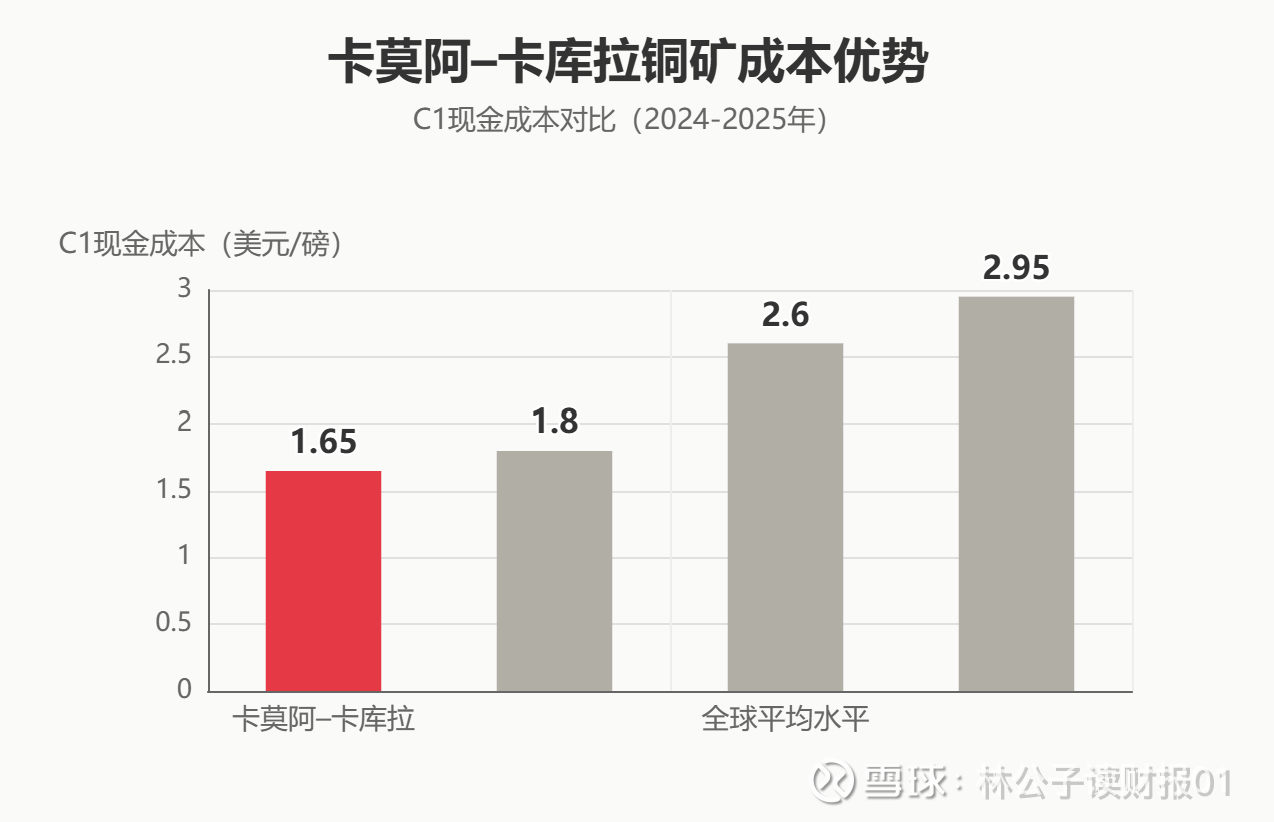 市场常引用“0.66美元/磅”为矿区现场C1成本(即不含运输和冶炼),若包含全链条,则在 1.2–1.4美元/磅 区间。即便如此,仍显著低于全球均值。