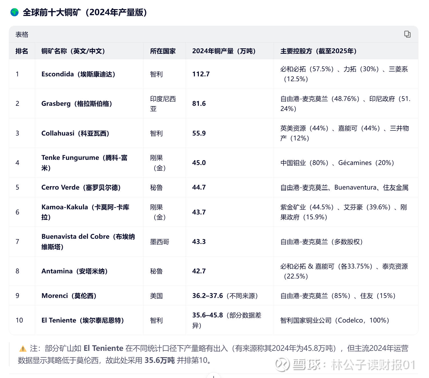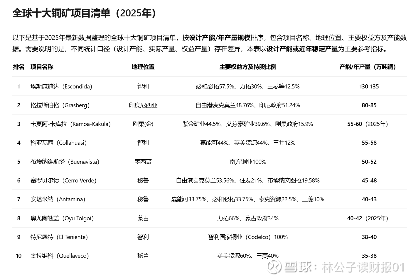 全球十大铜矿项目清单(名称、位置、权益方、产能)