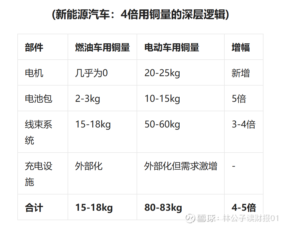 每辆电动车用铜量是燃油车的4倍(50–80kg vs 15kg);