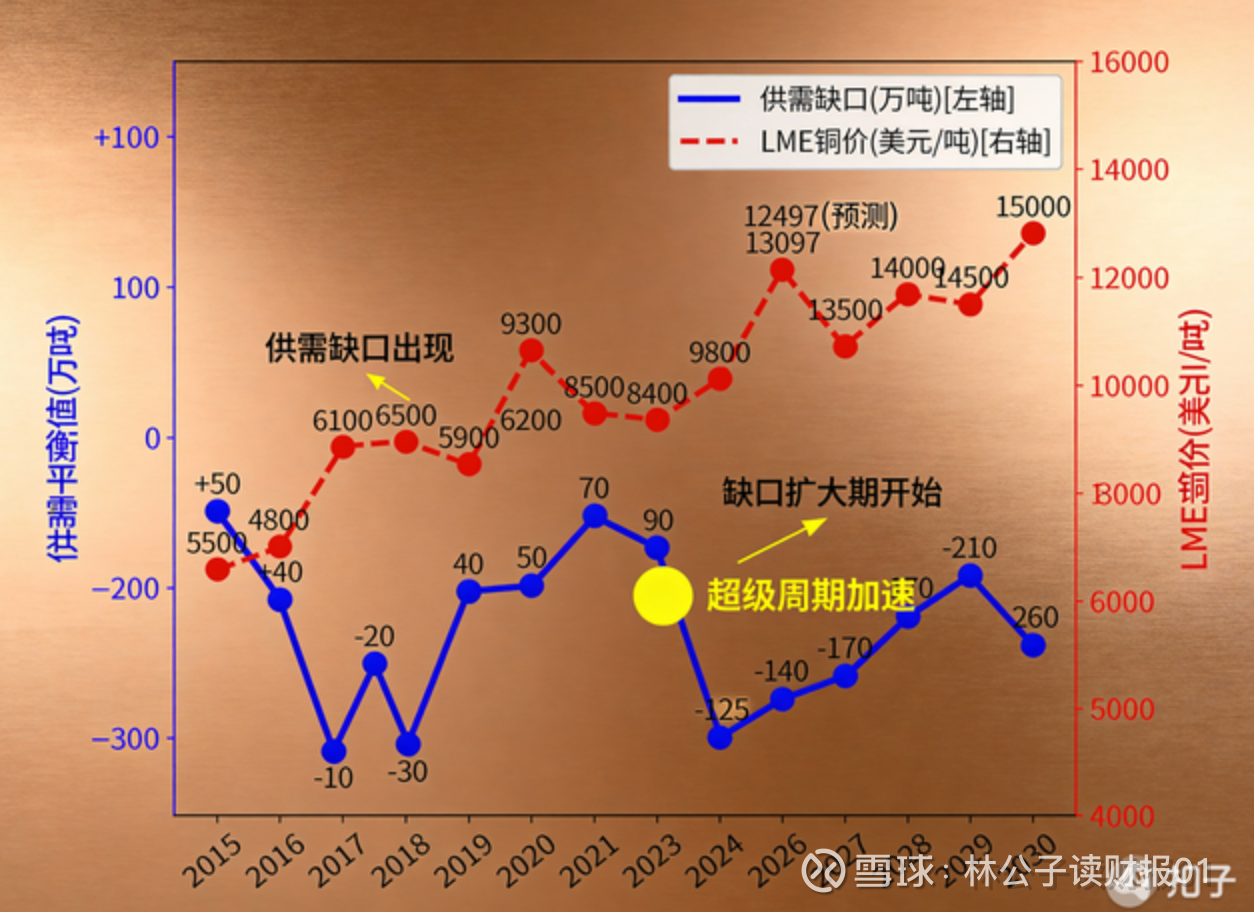 2015–2030年全球铜供需平衡与价格双轴折线图