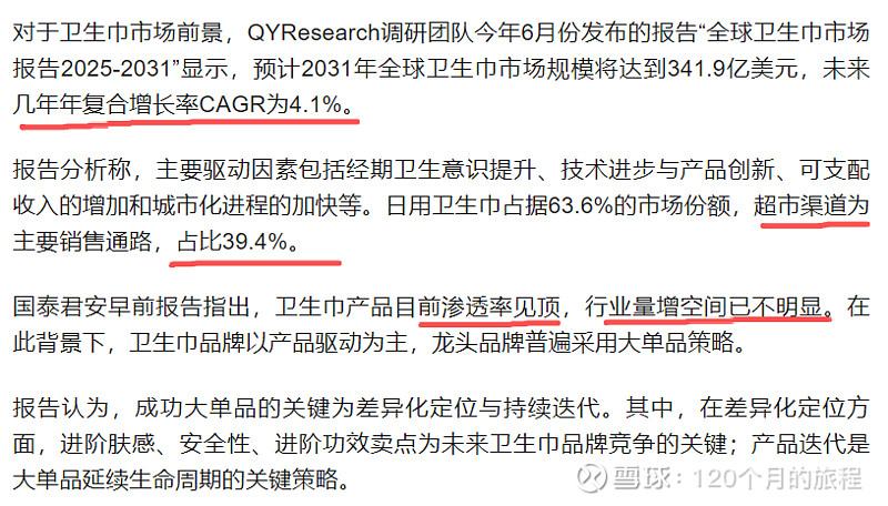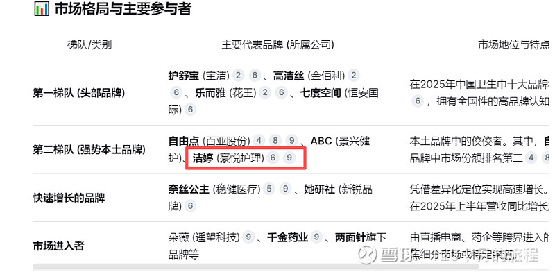 除了现在3家大的公司之外,在2025年,至少还有7家上市公司新增了卫生用品的业务,可以说僧多粥少,后续的竞争也不少了,都是靠钱砸出来的品牌,目前是增费用不见得增营业额的时代,且没有超额利润出来,巨头也没有出来,截止2025年12月,卫生用品的竞争格局和份额如下: