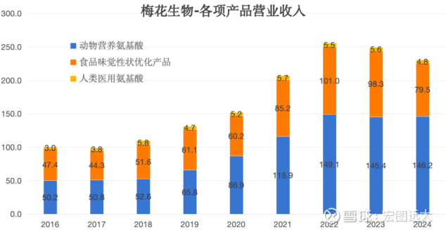 24年总营收250.7亿,动物营养氨基酸146亿,占比58%,人类医用氨基酸4.8亿,占比1.9%,食品味觉性状优化产品79.5亿,占比31.7%;公司主要营收来自动物营养氨基酸+食品味觉性状优化产品,这两项占总营收约90%,这两项的毛利率约在19.5%;